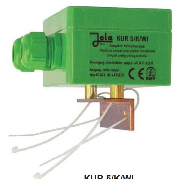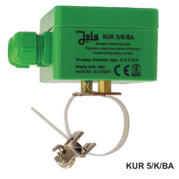 Conductive relay for mounting on a copper pipe. The compact cooling ceiling controllers are in protective circuit design: the potential-free changeover contact is in quiescent current design – in other words, the relay is energised when the sensor is dry